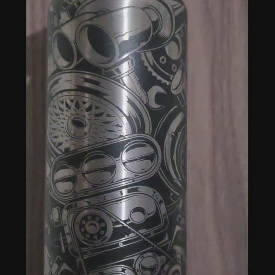 Engineered for those who live and breathe horsepower. This stainless-steel water bottle features an intricate laser-etched design of pistons, gears, and engine parts — precision cut to reflect the same craftsmanship that drives every great build.